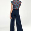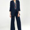 One of the trendiest styles of pants this season! Navy blue palazzo pants with flared legs. The model has practical pockets.