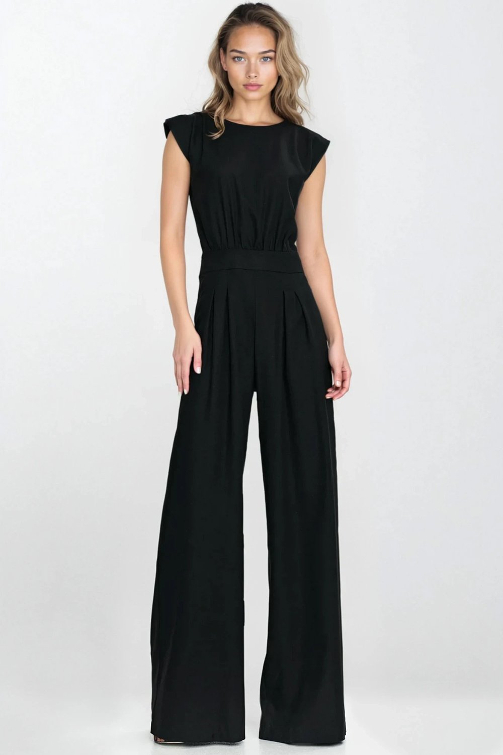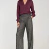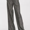 Stylish women’s trousers with a relaxed fit, made of material with a mélange texture and uneven color, which gives them a modern character. The model has a high waist and decorative front pleats, subtly emphasizing the silhouette. The wide leg pants are wide and long, providing comfort and freedom of movement. The pants have classic front pockets, and the back of the waist is equipped with an elastic band that adjusts the pants to the silhouette. An additional detail is the wide belt with decorative buttons, giving the whole an elegant, fashionable character.