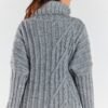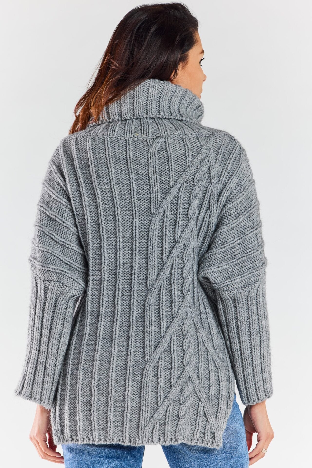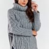 Warm women’s sweater with long sleeves and turtleneck. Turtleneck with decorative plaid embellishments. Slits on the sides.