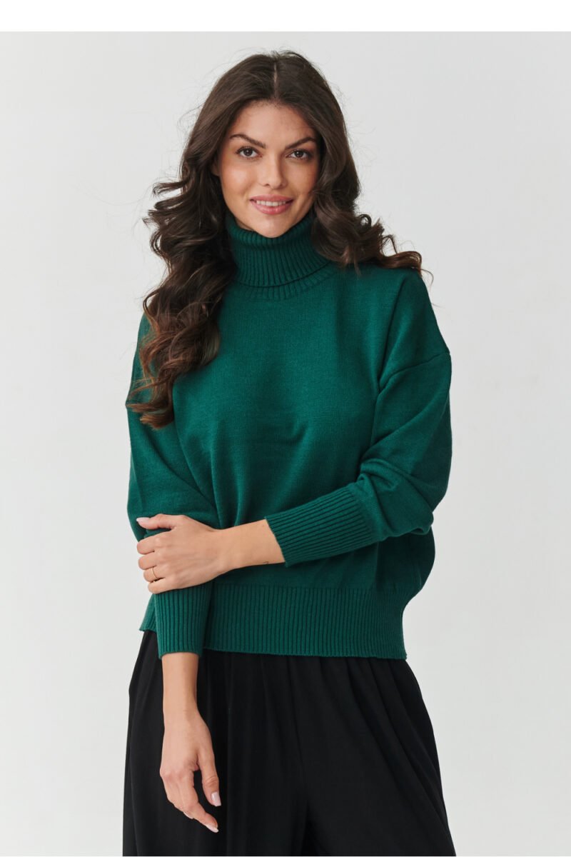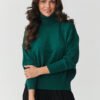 Bet on elegance and comfort at its best. This women’s turtleneck sweater is a must-have in every wardrobe. Made of high-quality knit fabric with a unique composition of 51% viscose, 30% PBT, and 19% nylon, it impresses with softness, elasticity, and durability. Thanks to the predominance of viscose, the sweater is extremely pleasant to the touch, allows the skin to breathe, and beautifully drapes on the silhouette. The addition of synthetic fibers ensures that the material does not deform, maintains its shape even after many washes, and does not pill, guaranteeing the product’s longevity. Why choose this model? The classic turtleneck protects against the cold and adds elegance, perfect for autumn and winter. The oversized cut with a slightly lowered shoulder line provides freedom of movement and comfort. Elastic cuffs on the sleeves and at the bottom of the sweater give the whole a fashionable character. Universal design – it will work perfectly in everyday, casual stylings, as well as in more elegant outfits for work or meetings. It pairs well with classic jeans, elegant fabric trousers, or a pleated skirt. You can wear it with both ankle boots and sporty sneakers and always look stylish. If you are looking for a sweater that combines comfort, quality, and timeless style, this turtleneck model will be your favorite wardrobe piece for many seasons.