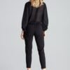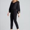 Black women’s trousers with brocade stripes, slightly tapered legs. Wide rubber band at the back waist, without pockets.