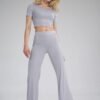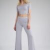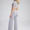 Long bell-bottom pants, wide elastic waistband, no pockets, and no zipper.