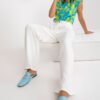 Fabric pants with a higher rise, with a zip and button fastening. Slip-on pockets on the sides. Ideal for many stylings.
