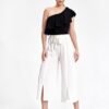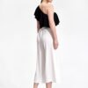 Bell-bottomed pants 7/8, decorative slit in the front at the bottom of the leg. Waistband with sewn in elastic band with decorative binding. No pockets, no fastening.