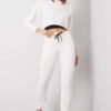 Women’s set consisting of a sweatshirt, T-shirt and pants. Short blouse with long sleeves and round neckline. T-shirt of matching cut without sleeves. Long pants of matching cut, with a tie at the waist, slip pockets on the sides.