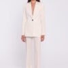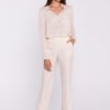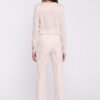 Elegant women’s fabric pants, distinguished by flared legs at the bottom, which add lightness to the silhouette and elongate the legs. The pressed edge emphasizes their classic and sophisticated character, ideal for both work and formal occasions. The pants have a high rise that beautifully accentuates the waist, while the covered zipper at the back provides a smooth, discreet closure. Designed and sewn in Poland, they combine excellent workmanship with a fashionable, feminine cut.
