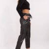 Women’s trousers made of shiny material that combine elegance with everyday comfort. Made of high-quality blend of viscose, cotton, and elastane, they provide comfort and perfect fit to the silhouette. The smooth material with a subtle shine gives them an elegant character, while the high waist and tapered legs beautifully emphasize the body shape. The trousers are equipped with practical side pockets and an elastic tie at the waist, allowing for individual adjustment to the silhouette. Perfect for both work and everyday outings, they pair well with elegant blouses, shirts, and casual tops.
