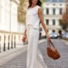 Women’s trousers with long legs. High waist top with tied waist and long, wide legs. The trousers have side, open pockets and an elastic band at the waist.