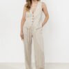 Linen trousers with wide legs in delicate stripes These trousers are the perfect combination of elegance and everyday comfort. Made of linen, they provide breathability and drape beautifully on the silhouette. The wide legs add freedom, while the elastic waistband ensures a perfect fit. The classic pattern of thin stripes makes them suitable for many outfits. Pair the linen trousers with a vest or a blazer made from the same fabric to create an elegant summer look.