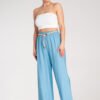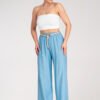 Boho pants with an elastic waistband and a decorative woven belt in a natural shade. Made of lightweight, breathable material. With elastic in the waist.