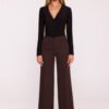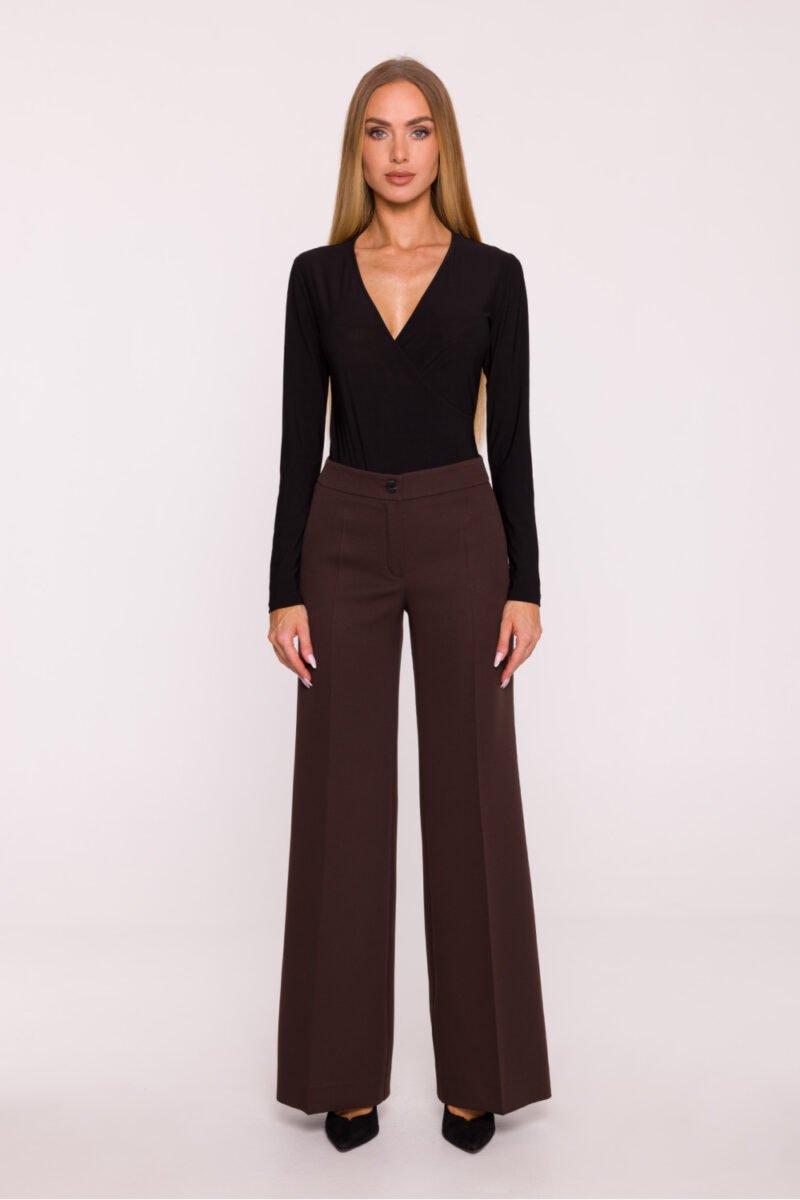 Classic women’s trousers made of smooth suiting fabric with a matte finish are an elegant and timeless option for many stylizations. The material maintains its structure, and the pressed creases on the legs add a refined character to the whole. The model with a medium waist fits at the waist and hips, while the wide leg from the thigh down provides comfort and freedom of movement. The button and concealed zipper closure at the front ensures comfort, while the side pockets add functionality. The trousers reach the ground, which, combined with the wide leg, visually lengthens the silhouette and emphasizes the elegant character of the entire outfit. The lack of lining makes the model lightweight and comfortable to wear. Designed and made in Poland, for women who appreciate classic style, comfort, and excellent craftsmanship.