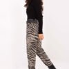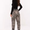 Ladies’ casual style fabric trousers, perfect for everyday wear. Made from a blend of viscose, polyester, and elastane, they combine comfort with flexibility and durability. The high-waisted model with tapered legs and an elastic waistband ensures comfort, while the belt accentuates the waist. Side slip pockets and a trendy zebra pattern throughout the material give the trousers a modern, distinctive character.