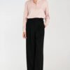 Elegant women’s trousers with a loose relaxed fit and high waist, which beautifully emphasize the waist and visually elongate the legs. The model features decorative pleats at the front and wide, long wide leg trousers, giving the silhouette lightness and freedom. The trousers have a zip and button fastening at the front, classic side pockets and faux back pockets, adding an elegant touch to the overall look. Belt loops at the waist allow you to wear your favorite belt and accentuate the waist. A stylish model that will work well in office outfits as well as in elegant ensembles for special occasions.