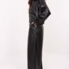 Stylish and comfortable palazzo-style pants made of high-quality eco-leather (a combination of polyester and polyurethane). The wide-legged and high-waisted design beautifully accentuates the waist while providing freedom of movement. An elastic band is sewn into the waist, ensuring a perfect fit. Additionally, they have a fastening belt that allows you to emphasize the figure and add an elegant touch. The model has side pockets and a smooth material surface, giving it a modern, minimalist character. This is an ideal proposal in a casual style, suitable for both everyday wear and work, guaranteeing comfort and a fashionable look throughout the day.