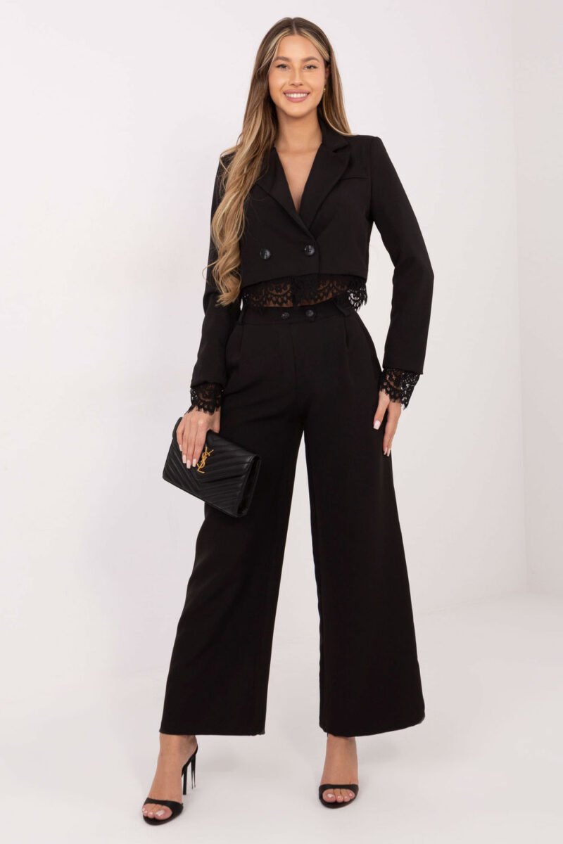 Elegant women’s palazzo pants are a perfect choice for everyday wear, work, and more formal occasions. Made of high-quality polyester with a touch of elastane, they provide comfort, durability, and a delicate elasticity that allows for freedom of movement. The smooth fabric gives them a classic and timeless character. The high-waisted model beautifully accentuates the waist and visually elongates the silhouette, while the long, wide legs add lightness and elegance to the outfit. The pants are fastened with a zipper and buttons, ensuring a good fit. Practical, side slip pockets increase functionality and comfort of use. They pair perfectly with both a shirt and a blazer, as well as a more casual blouse.