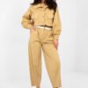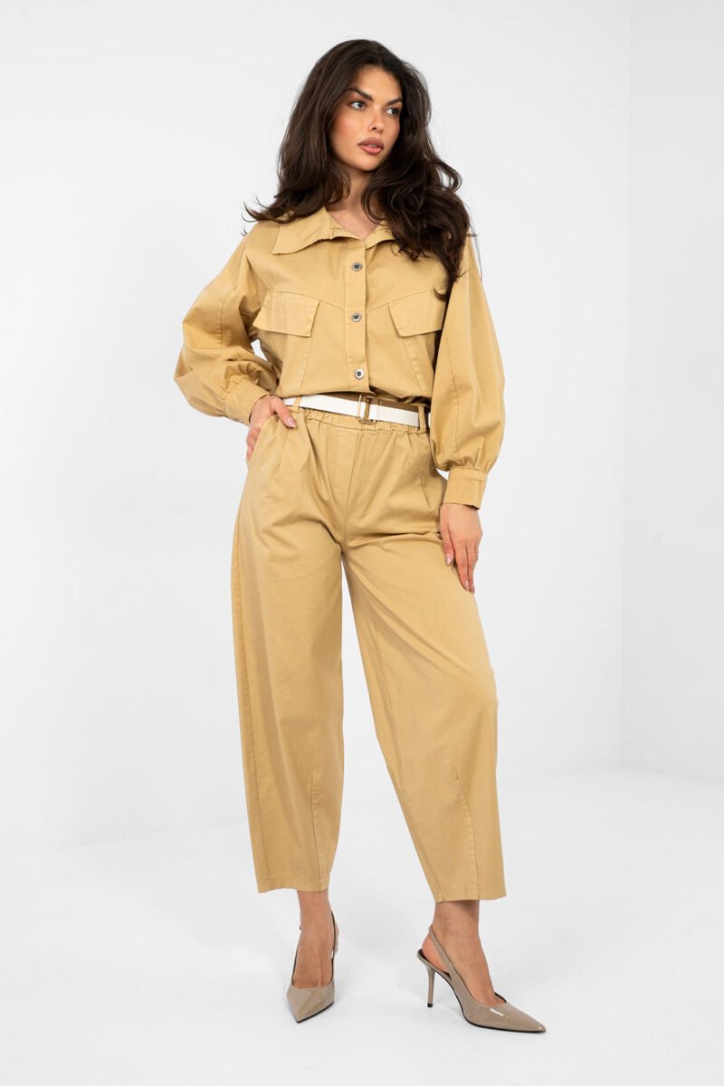 Comfortable and stylish carrot-cut trousers, perfect for everyday casual styling. Made of high-quality cotton with a touch of elastane, providing comfort and lightness of wear as well as subtle elasticity. The trousers have a high waist, tapered legs reaching a length of 7/8, giving them a modern character. There is an elastic band at the waist, and additionally, the trousers are equipped with a belt with a fastening option, allowing for a perfect fit. Practical side pockets increase functionality, and a smooth pattern makes them easy to combine with various wardrobe elements. These trousers are an excellent choice for those who value comfort, freedom of movement, and a modern casual look.