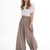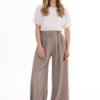 Elegant trousers with wide legs in a modern, loose cut. The high waist beautifully accentuates the waist, and front pleats give the silhouette lightness and elegant character. Loose legs softly fall in motion, providing comfort and a stylish look. The model will work well in both everyday stylizations and more elegant sets with a T-shirt, shirt, or blazer. It is a timeless cut that can easily be matched to many occasions.